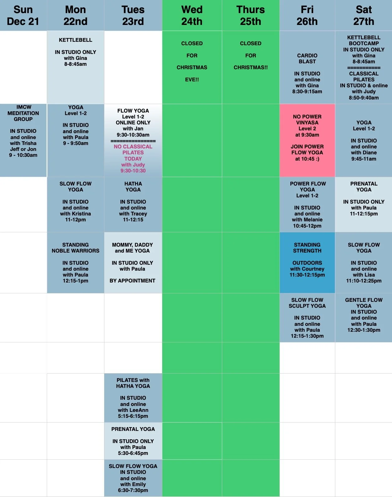 Weekly Schedule Sunday, December 21, 2025 9:00 AM 09:00 Saturday, December 27, 2025 3:00 PM 15:00 Body Grace Fitness & Yoga 215 Mill Street, NE Vienna, Virginia 22180 (map) Google Calendar ICS