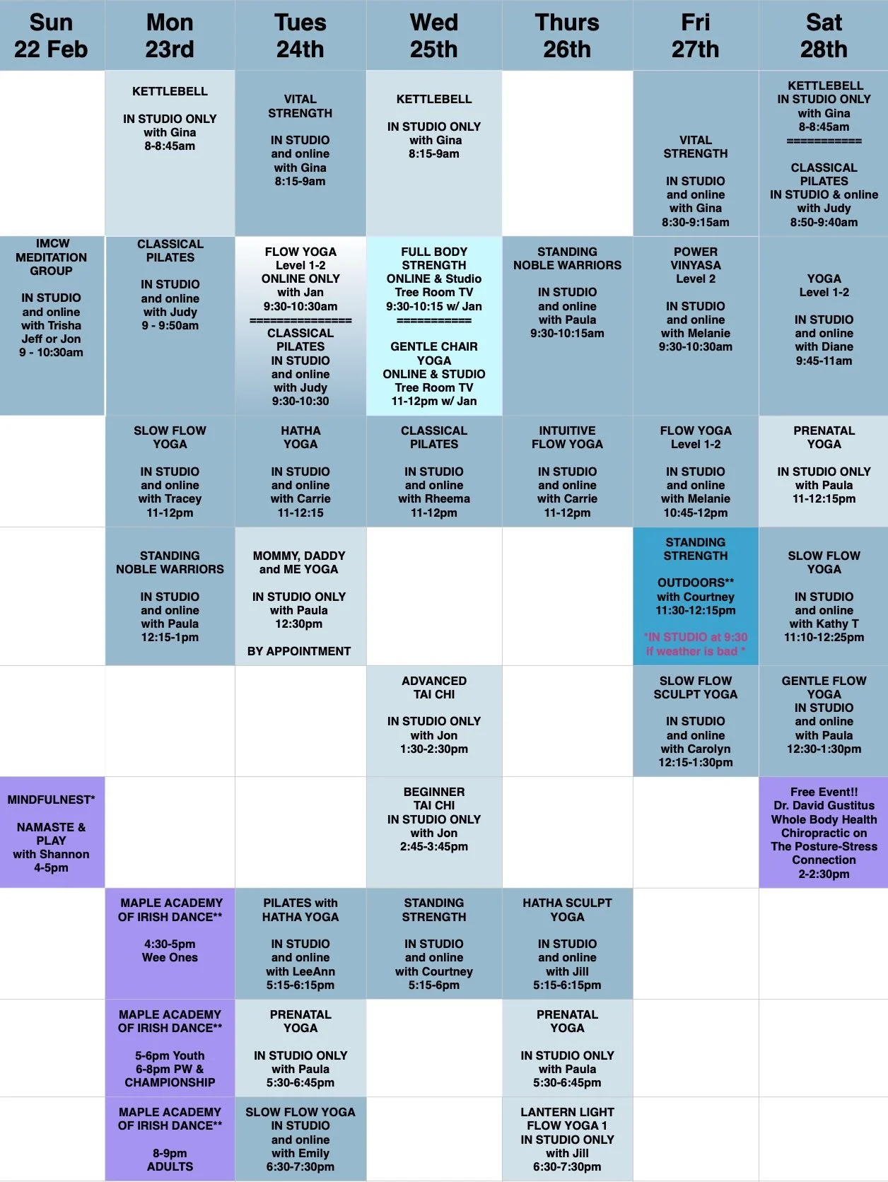 Weekly Schedule Sunday, February 22, 2026 11:00 AM 11:00 Saturday, February 28, 2026 2:00 PM 14:00 Body Grace Fitness & Yoga 215 Mill Street, NE Vienna, Virginia 22180 (map) Google Calendar ICS
