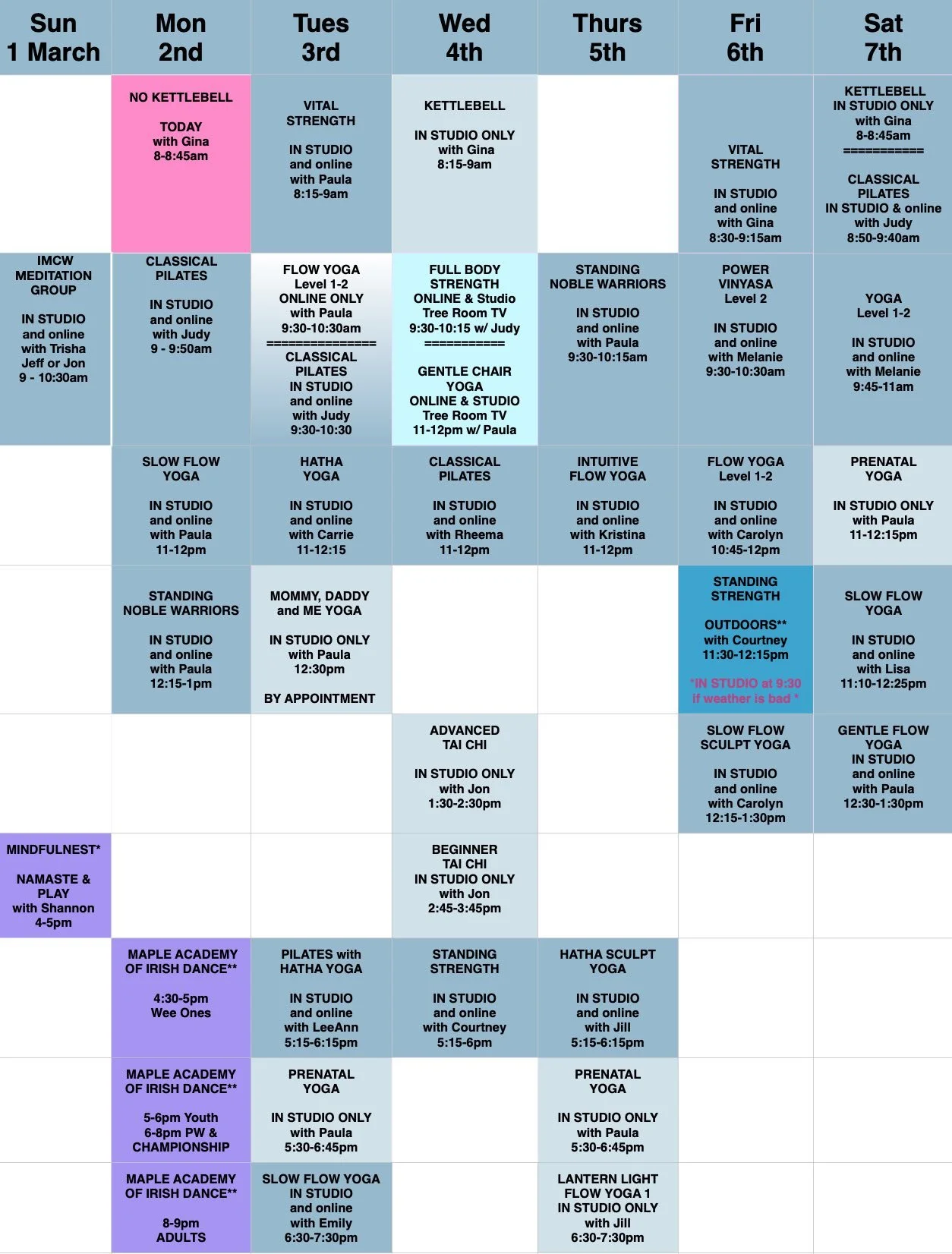 Weekly Schedule Sunday, March 1, 2026 9:30 AM 09:30 Saturday, March 7, 2026 2:30 PM 14:30 Body Grace Fitness & Yoga 215 Mill Street, NE Vienna, Virginia 22180 (map) Google Calendar ICS