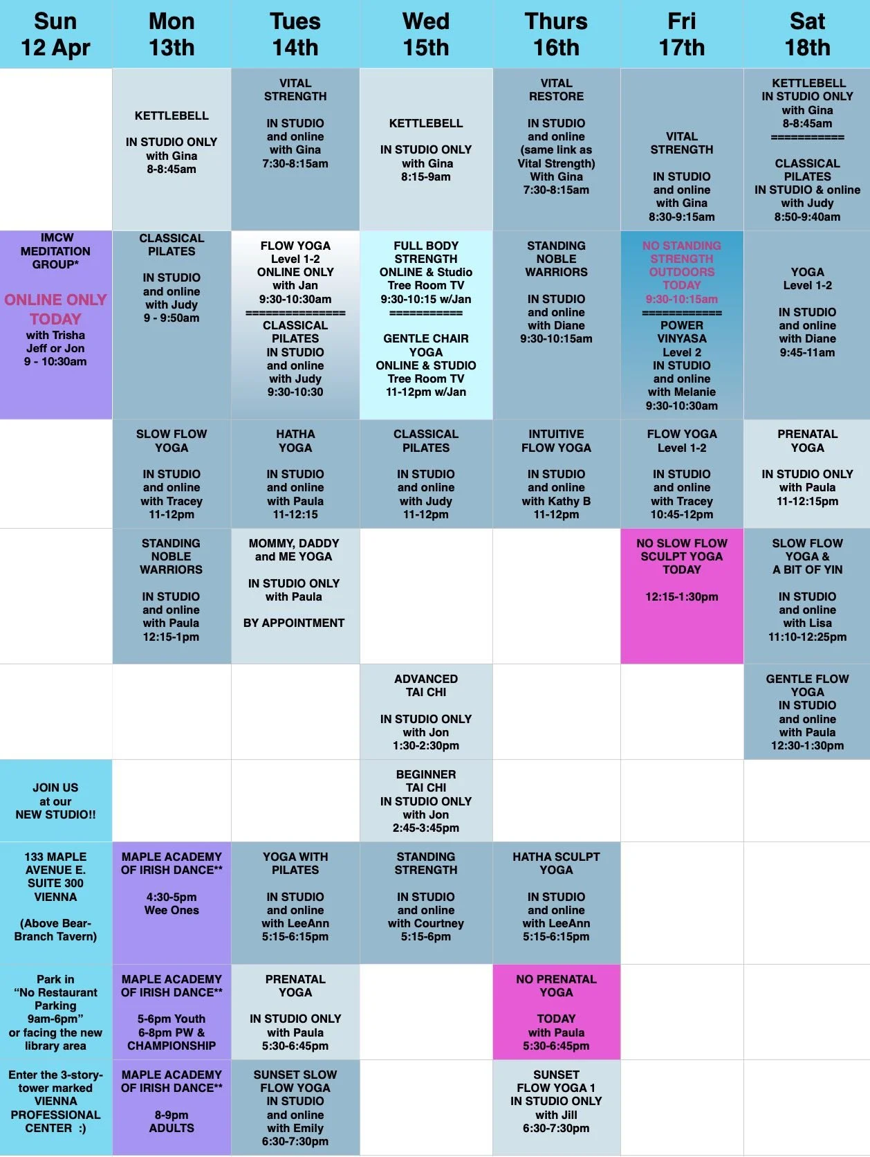 Weekly Schedule Sunday, April 12, 2026 10:30 AM 10:30 Saturday, April 18, 2026 2:30 PM 14:30 Body Grace Fitness & Yoga 215 Mill Street, NE Vienna, Virginia 22180 (map) Google Calendar ICS