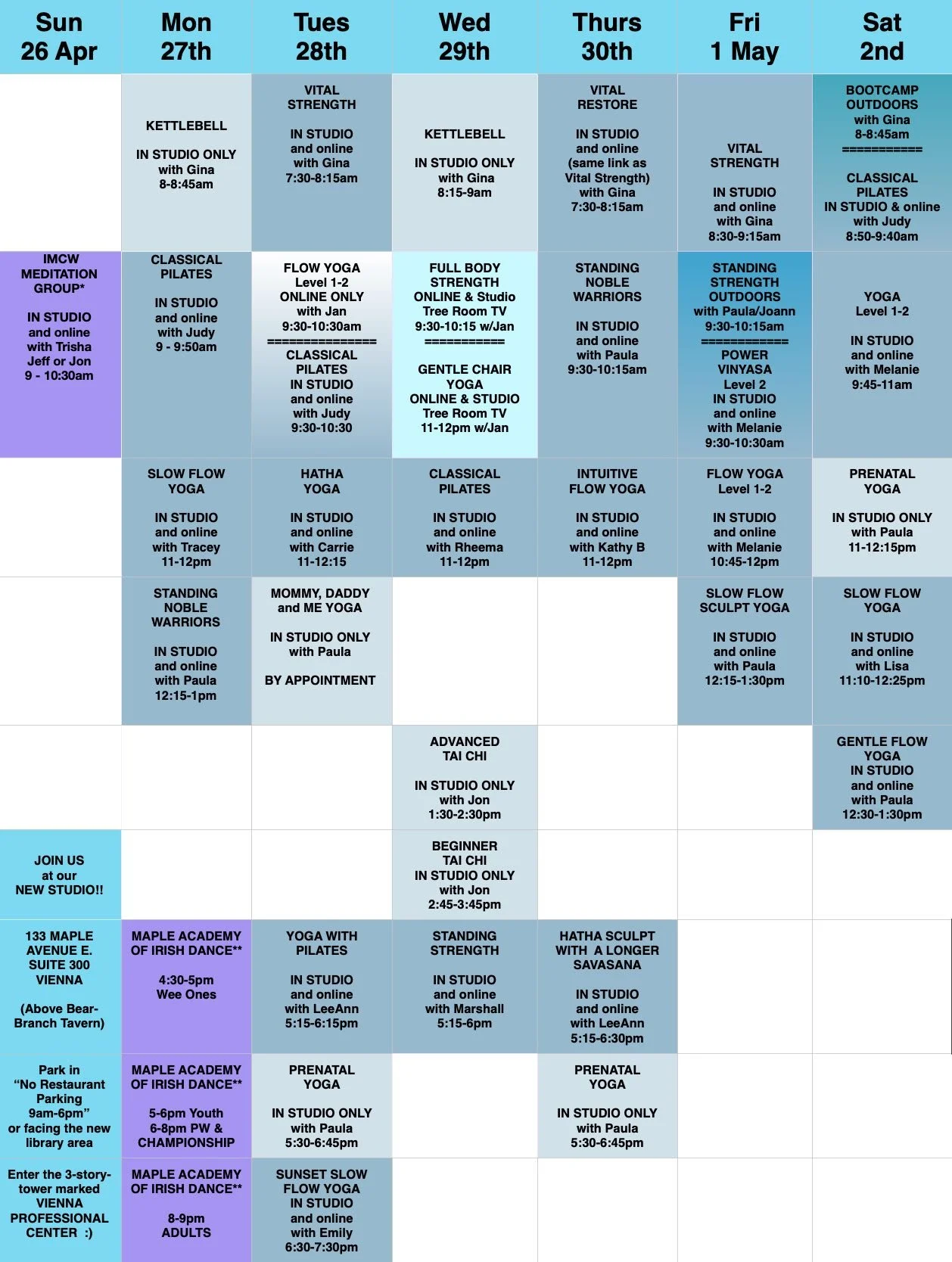 Weekly Schedule Sunday, April 26, 2026 11:30 AM 11:30 Saturday, May 2, 2026 2:30 PM 14:30 Body Grace Fitness & Yoga 215 Mill Street, NE Vienna, Virginia 22180 (map) Google Calendar ICS