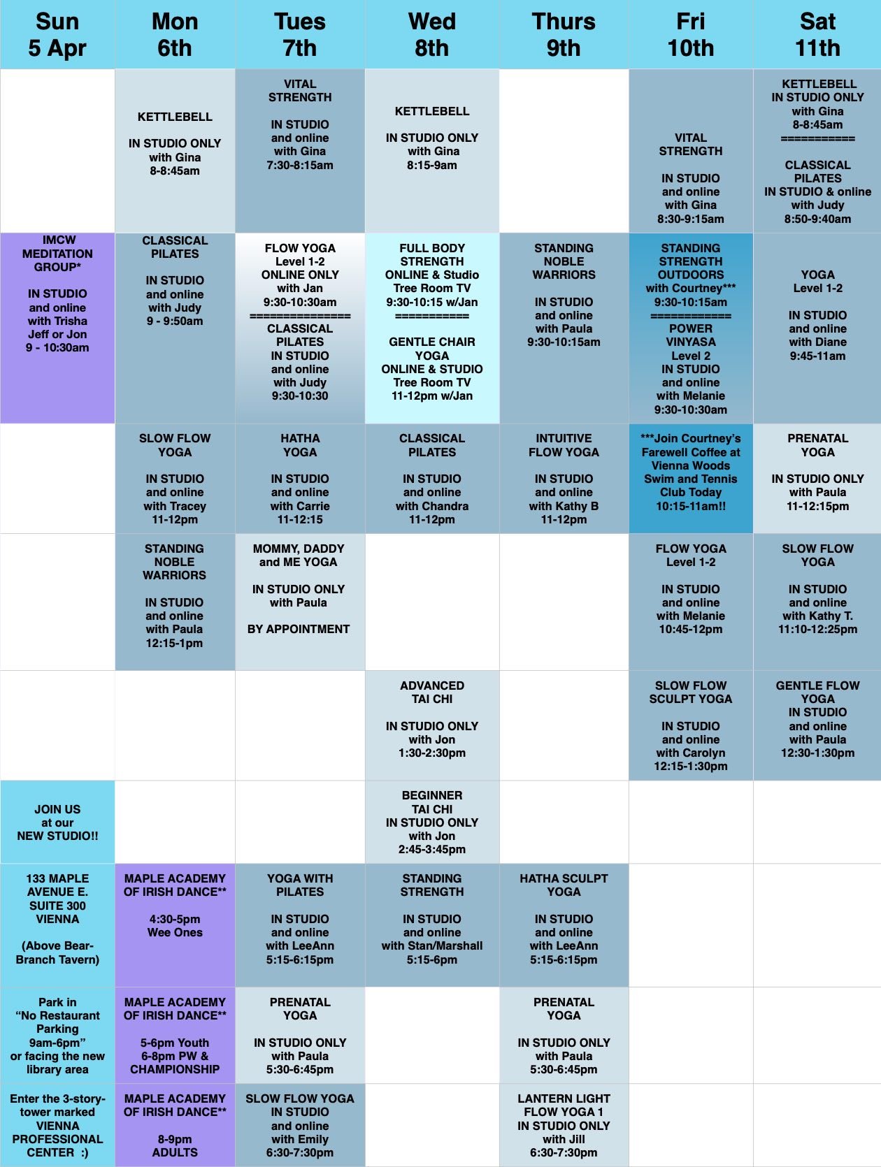 Weekly Schedule Sunday, April 5, 2026 10:30 AM 10:30 Saturday, April 11, 2026 2:30 PM 14:30 Body Grace Fitness & Yoga 215 Mill Street, NE Vienna, Virginia 22180 (map) Google Calendar ICS